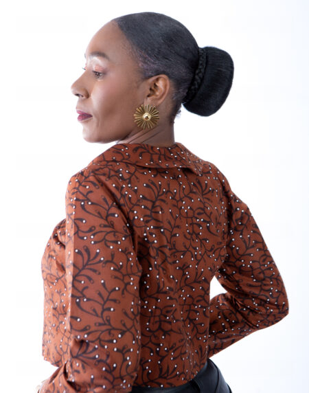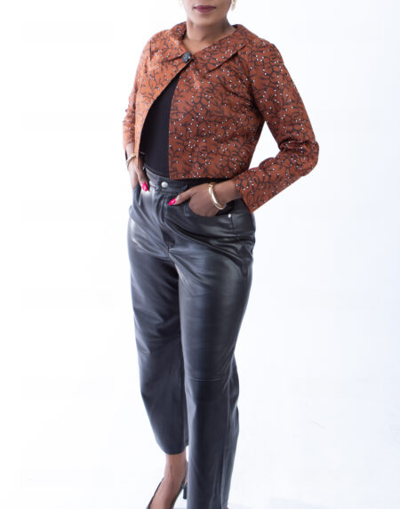 Introducing the Anna Beautiful Deep Brown Ankara Print Cropped Jacket—a stunning fusion of traditional craftsmanship and contemporary style.