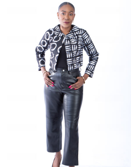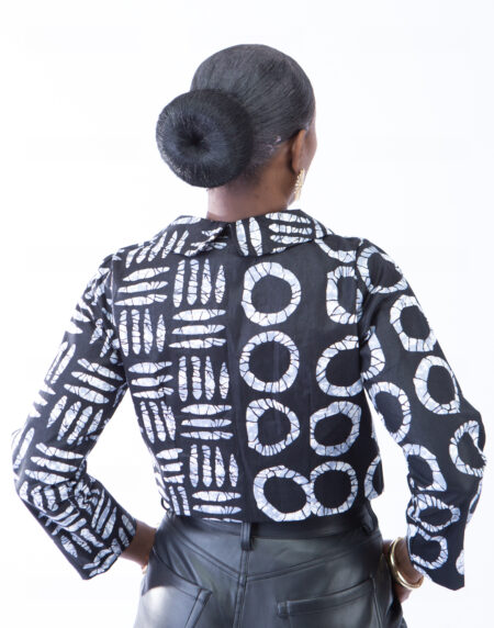Introducing the Anna Beautiful Black and White Cross Ankara Cropped Jacket—a striking blend of modern artistry and traditional craftsmanship.