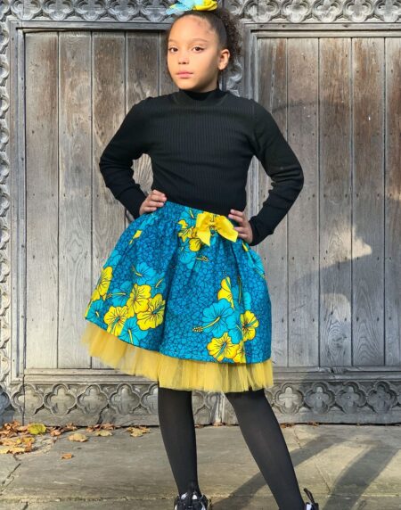 Make sure your child is the best dressed in our Bola Blue and Yellow Floral Ankara Kids Bow & Skirt Set.
