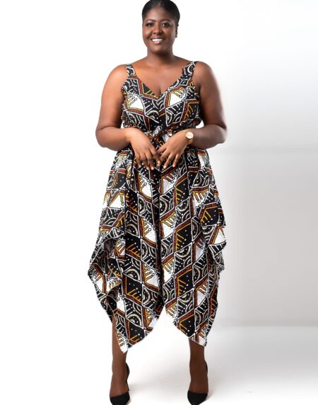 This Rehema Black & Multi V-neck Ankara Jumpsuit is ideal for that special occasion or event. It has thick, comfortable straps and a midi low v-neck style that is very flattering and leaves room for jewellery. It also has a distinct design with high sides on the legs, which contributes