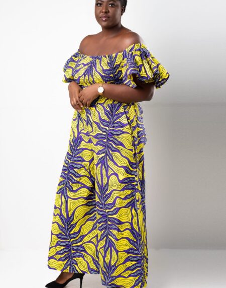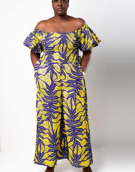 Mariama Yellow & Purple African Ankara Bardot Wide Leg Jumpsuit