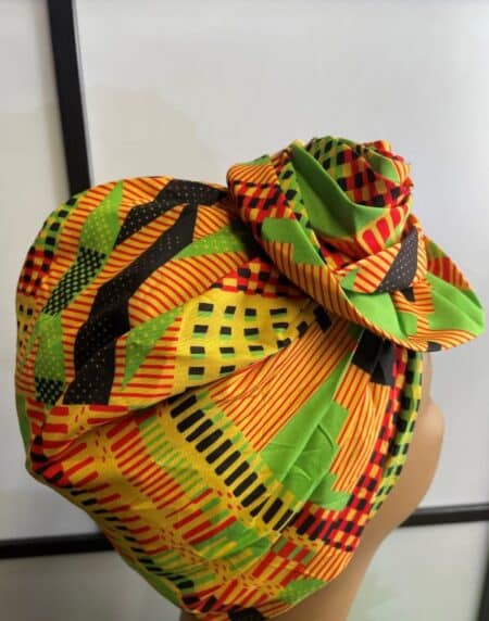 This pre-tied yellow & black African print head wrap or turban is the perfect accessory to brighten your outfit! With a pre-tied knot, this head wrap is already sewn in the shape of a turban so no fuss, just wear and go!