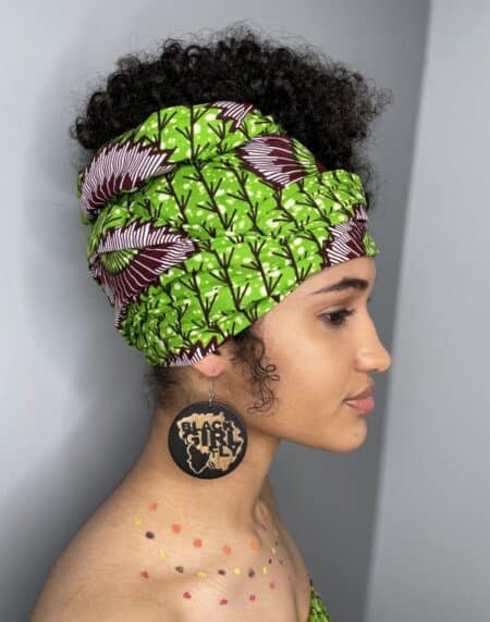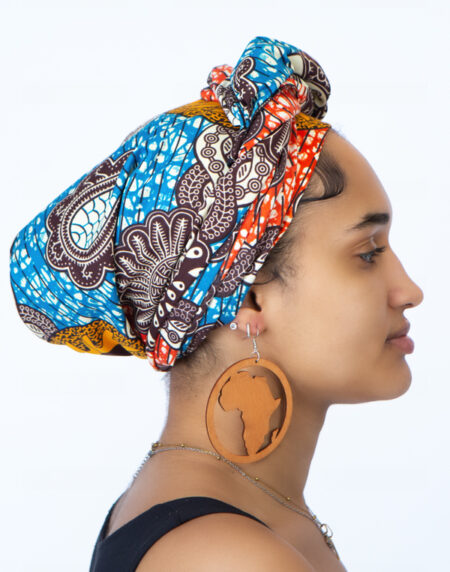 Add colour to your outfit with our beautiful handmade head wrap and earrings set. Use as a neck scarf or shawl or style our head wrap into an elegant turban. Use to create many different head wrap styles. Perfect as a gift, this head wrap comes with beautiful African wooden