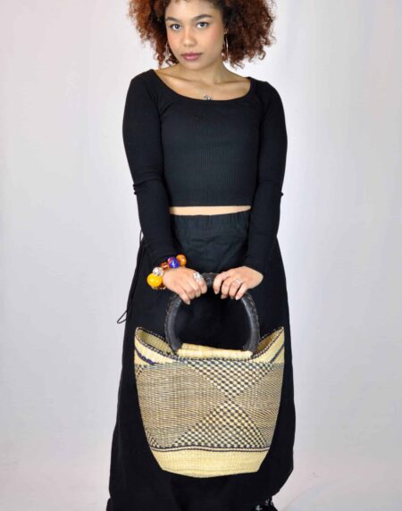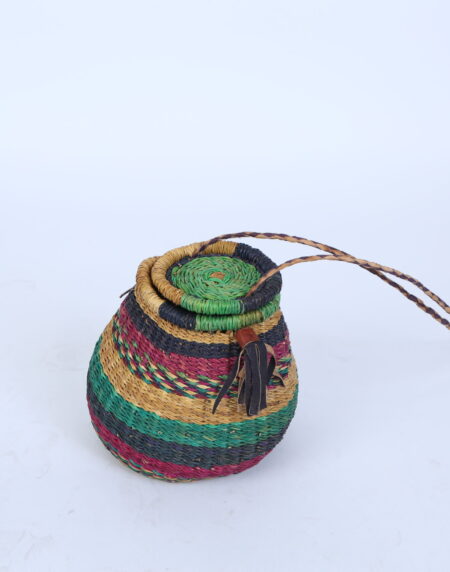 This handwoven round basket is a stunning example of Ghanaian craftsmanship, meticulously created using traditional weaving techniques.