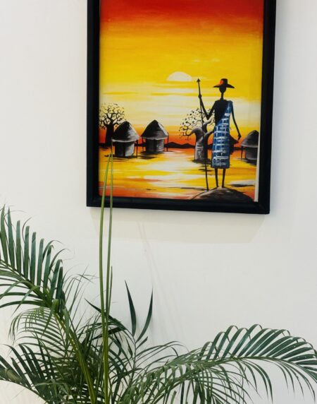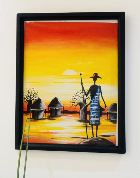 Our Man with Spear in Front of Huts and Sunrise is one of three Joseph Art pieces. Immerse yourself in the breathtaking beauty of African landscapes.