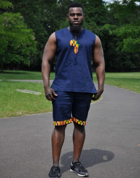 Keep your style game on point with this Blue & African Print Trim Short Matching Set! This short pants set with African print is on fire! Perfect for festivals, parties or every day wear. The map of Africa and hem detail in Kente print finishes the look to perfection!