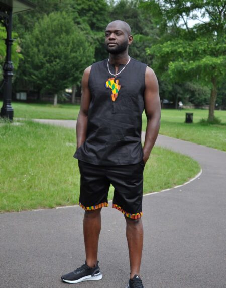 Keep your style game on point with this Black & African Print Trim Short Matching Set! This short pants set with African print is on fire! Perfect for festivals, parties or every day wear. The map of Africa and hem detail in Kente print finishes the look to perfection!
