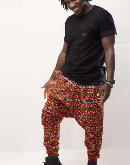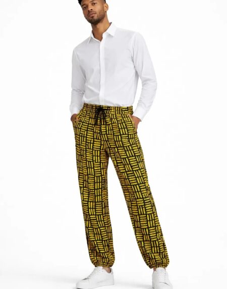 Bold African print jogger trousers crafted from authentic Ankara cotton, featuring a comfortable elastic waist and tapered fit for stylish everyday wear.