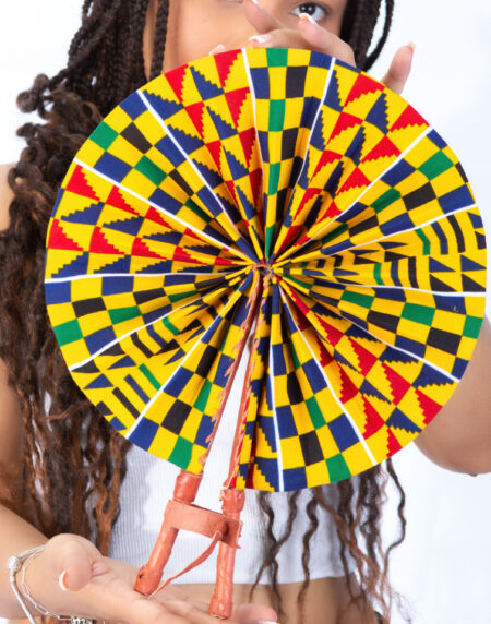 Introducing our Colourful Yellow Kente Print Round Closable Fan – a stunning blend of vibrant design and functional elegance.