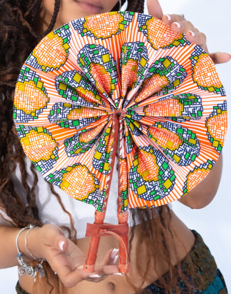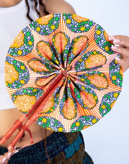 Introducing our Beautiful Orange Abstract Ankara Print Round Closable Fan – a stunning blend of vibrant design and functional elegance.