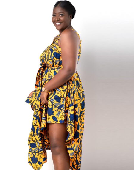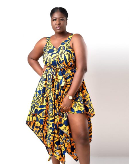 This Asha Yellow & Blue V-neck Ankara Jumpsuit is the perfect jumpsuit for that special occasion or event.It has comfortable thick straps as well as a midi low v-neck style which is very flattering and allows room for jewellery to be added.It also has a unique design of high sides on
