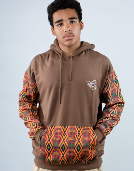 The Unisex Afro-Fusion Hoodie in Brown fuses sleek streetwear with vibrant Ankara prints—comfort with a powerful cultural edge.