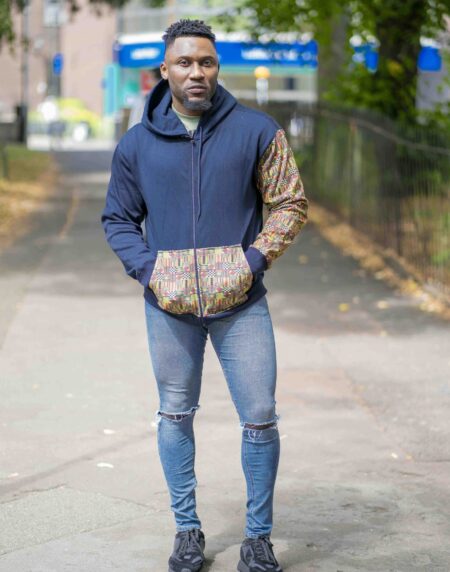 The Unisex Afro-Fusion Hoodie in Navy Blue blends bold Ankara with everyday ease.Crafted from a soft, breathable cotton blend.