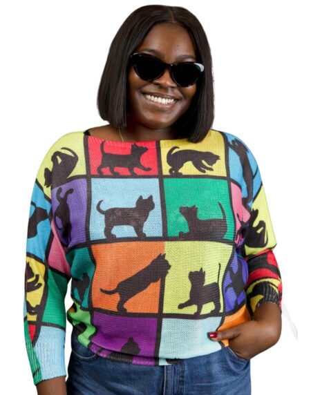 Colorful cat silhouette knit top with bold patchwork, soft breathable fabric, and a relaxed fit. Fun, stylish, and perfect for cat lovers.