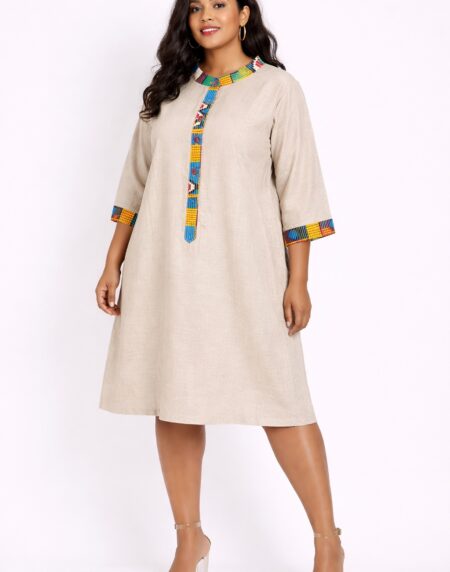 Elegant beige midi dress with vibrant African print trim. Lightweight, flattering fit with ¾ sleeves – perfect for everyday, work, or cultural occasions