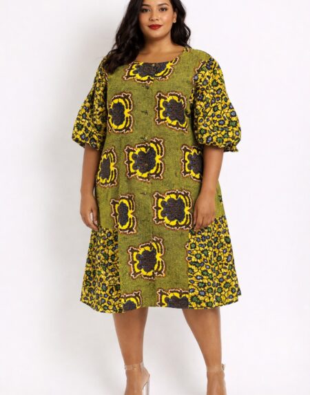 Bold green and yellow African print midi dress with puff sleeves. Flattering, breathable, and perfect for work, events, or summer occasions.