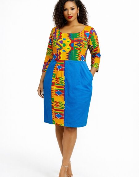 Women’s African print midi dress with Kente patchwork and royal blue panel. Flattering fit, pockets, and elegant style for work or events.