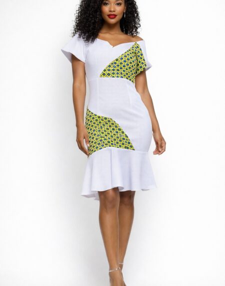 Elegant African print dress featuring an off-shoulder neckline and a graceful front slit. Designed to celebrate femininity and culture, this flowing silhouette is perfect for weddings, galas, and special cultural celebrations.