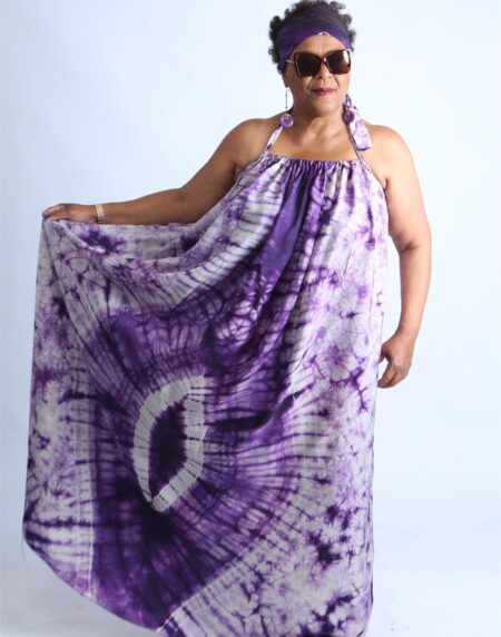 Bring vibrant color and effortless comfort into your wardrobe with this purple tie-dye kaftan and matching headscarf. Inspired by African fashion.