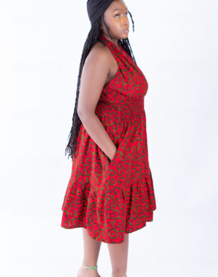 Sweetie Red Vine Ankara Print African Halter Swing Dress
