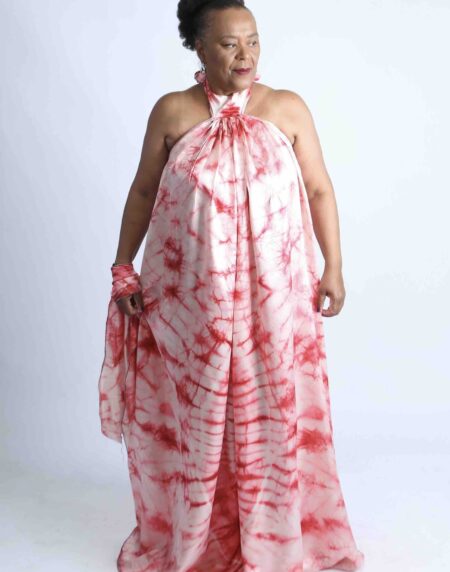 Bring vibrant color and effortless comfort into your wardrobe with this pink tie-dye maxi dress and matching headscarf. Inspired by African fashion.