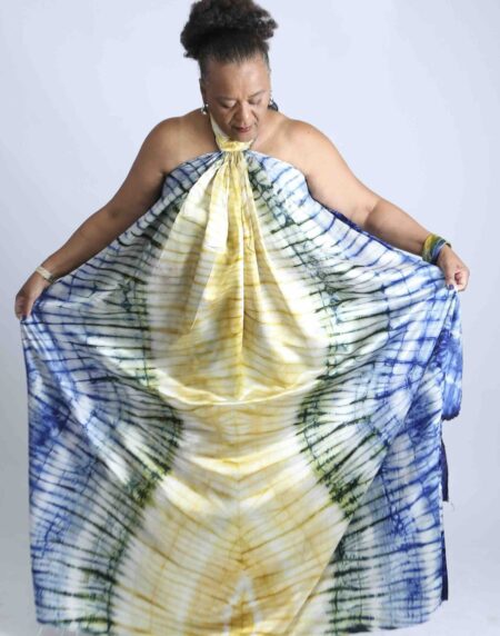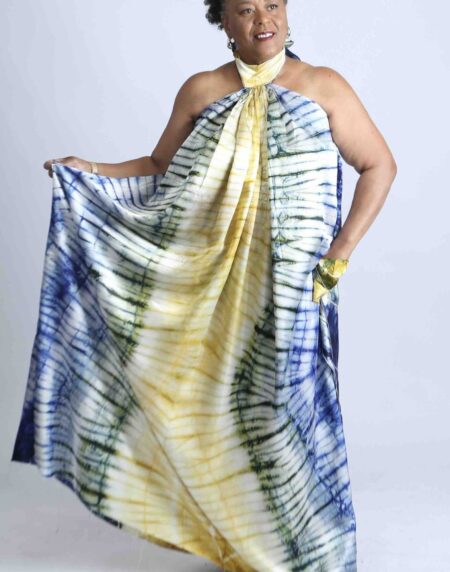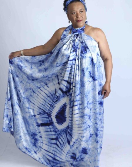 Bring vibrant color and effortless comfort into your wardrobe with this blue tie-dye maxi dress and matching headscarf. Inspired by African fashion.