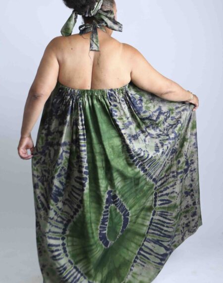 Bring vibrant color and effortless comfort into your wardrobe with this green tie-dye maxi dress and matching headscarf. Inspired by African fashion.