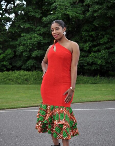 The Ankara fusion style of a red jersey main part of the dress mixed with the Ankara frilled hem helps to set a unique look.The jersey material is also very comfortable and stretchy making it very comfortable.