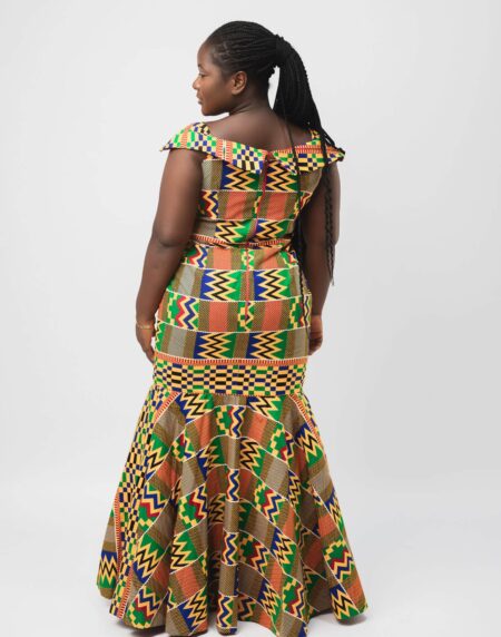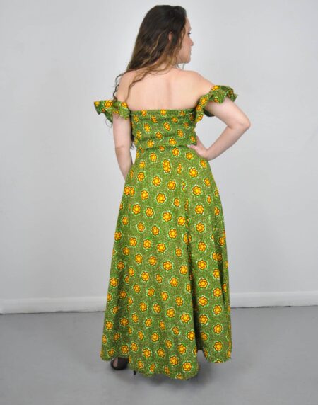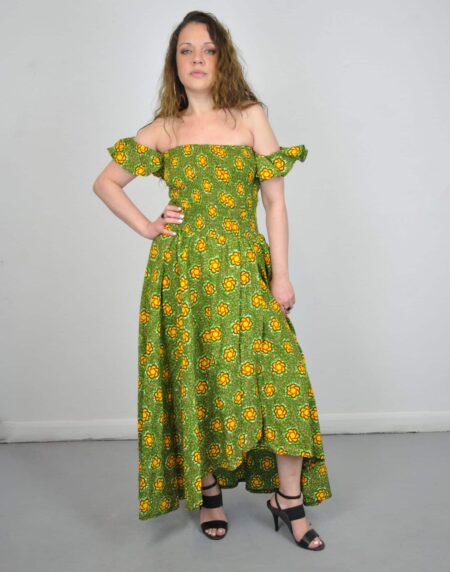 Introducing our breathtaking Zora Off Shoulder Dress in a stunning green Ankara print. This dress is a true embodiment of elegance, grace, and the vibrant spirit of African fashion. In light of this, the off-the-shoulder neckline adds a touch of sophistication, while the A-line silhouette with a train creates a