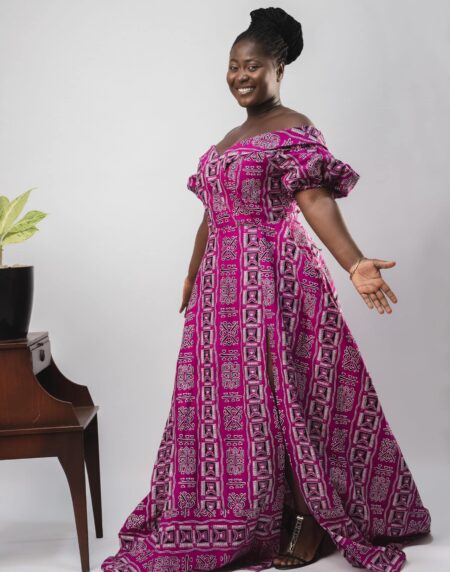 The Achieng Ankara Gown Slit Dress featured on our platform is a breathtaking ensemble that effortlessly captures attention.