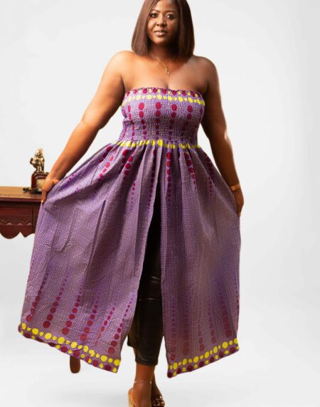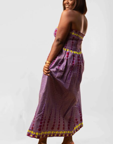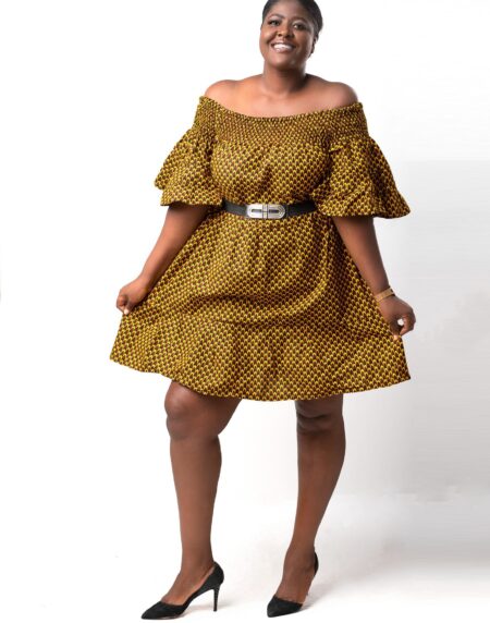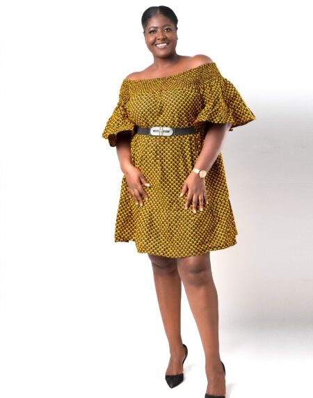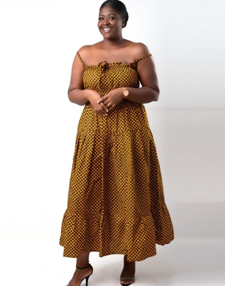 This Thando Yellow African Ankara Print Bardot Midi Maxi Dress is the perfect dress for any event.It has a comfortable elasticated Bardot fit with short wide sleeves.It also has a midi length maxi fit which makes it suitable for wide range of occasions and be dressed either up or down with