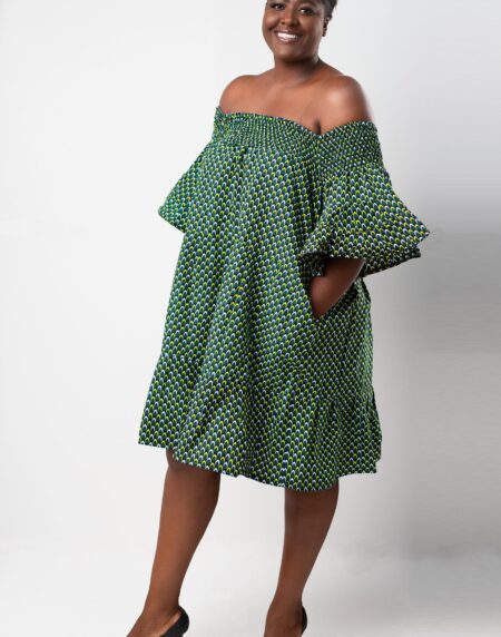 Thando Green African Ankara Print Bardot Midi Maxi Dress