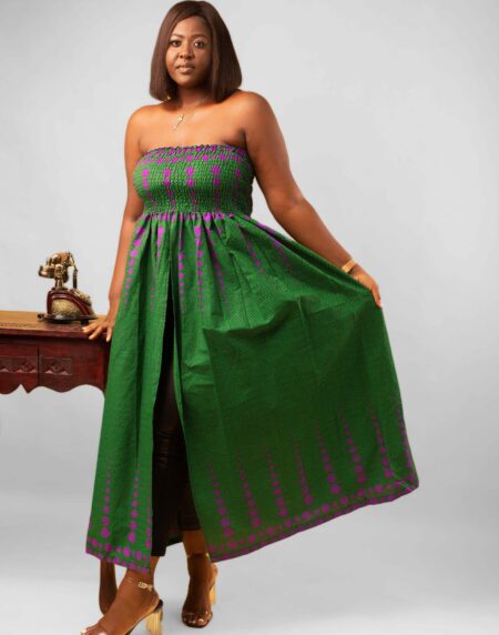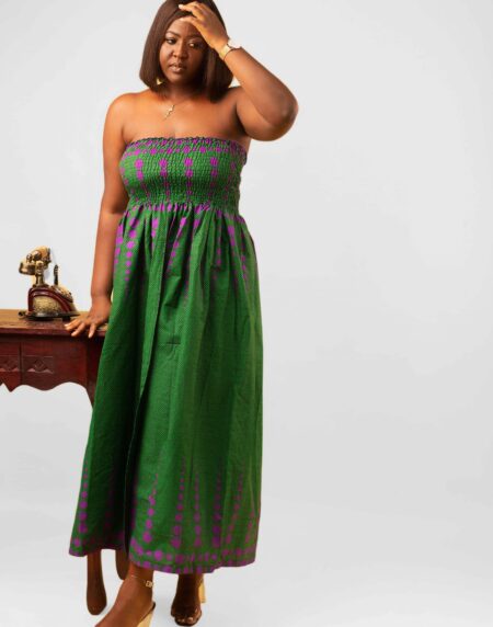 This Thando Green African Ankara Print Bardot Midi Maxi Dress is the perfect dress for any event.It has a comfortable elasticated Bardot fit with short wide sleeves.It also has a midi length maxi fit which makes it suitable for wide range of occasions and be dressed either up or down with