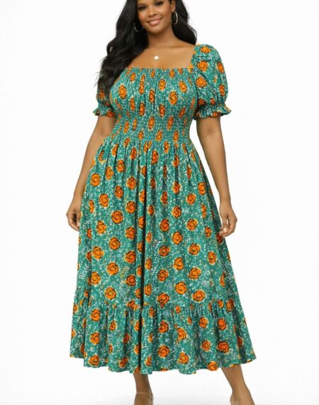 Bold green and yellow African print midi dress with puff sleeves. Flattering, breathable, and perfect for work, events, or summer occasions.