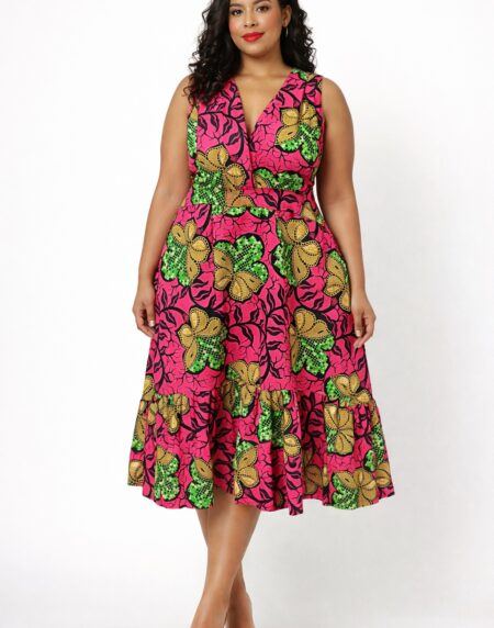 Vibrant pink and green African print sleeveless midi dress with a flattering fit. Lightweight, stylish, and perfect for summer outings or special occasions