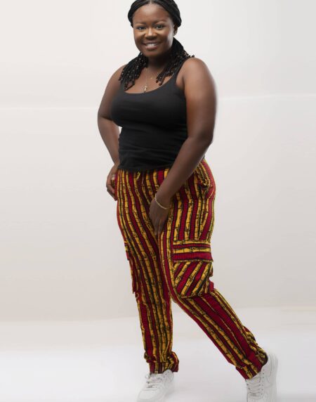 With red and yellow gold striped African print, these fabulous ladies' combat trousers are perfect for holiday or everyday wear. Designed for comfort and convenience, these lightweight pants feature an elasticated waistband, zipper fly, and pockets. Pair with trainers for a relaxed look or with sliders for that chilled vibe.
