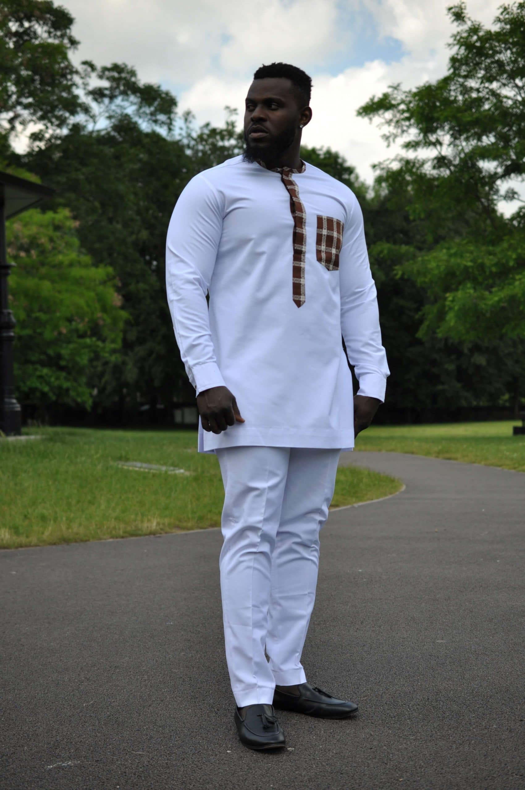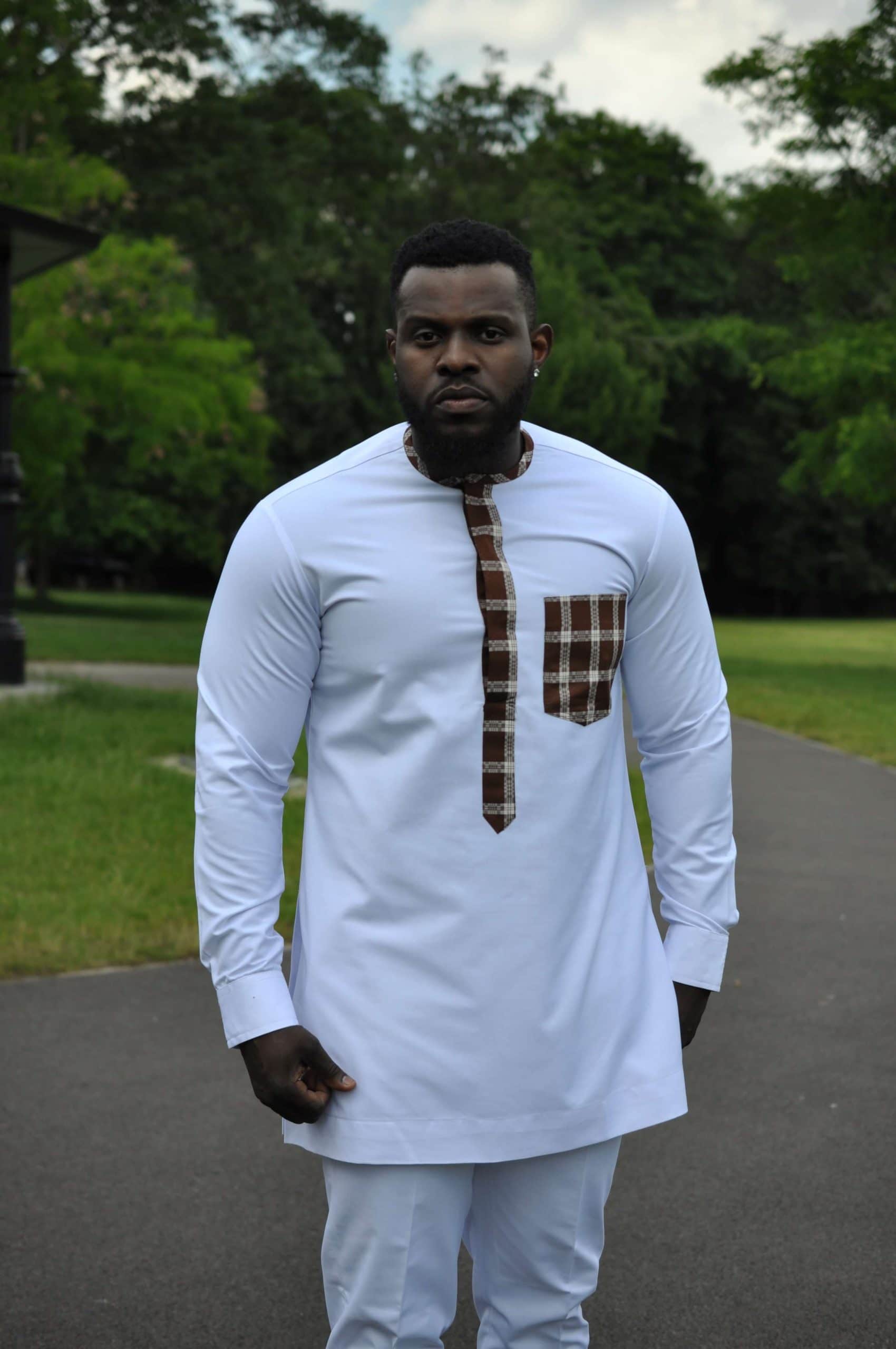 Looking for a suit that fits your perfectly? Then this custom made Abebe White African Men’s Suit with plaid check is the suit for you! An African-inspired suit design with a modern European twist, this suit is perfect for any occasion such as weddings, engagement parties and other similar outings. Buy the two piece set (includes the shirt and trousers) or buy the top or pants separately. Worldwide Shipping is available. Free UK Shipping!