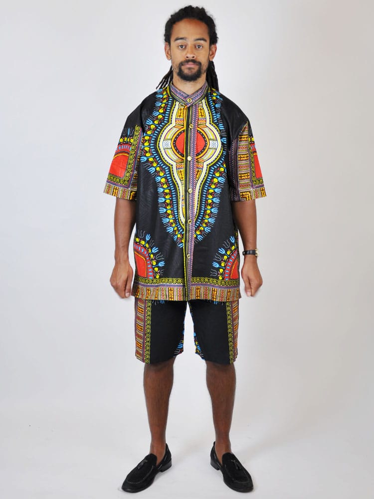 Perfect for holidays, festivals, parties or any summer event. This African-inspired design, includes a black African Dashiki print short sleeve shirt and matching shorts. Free UK Shipping. Worldwide Shipping available.