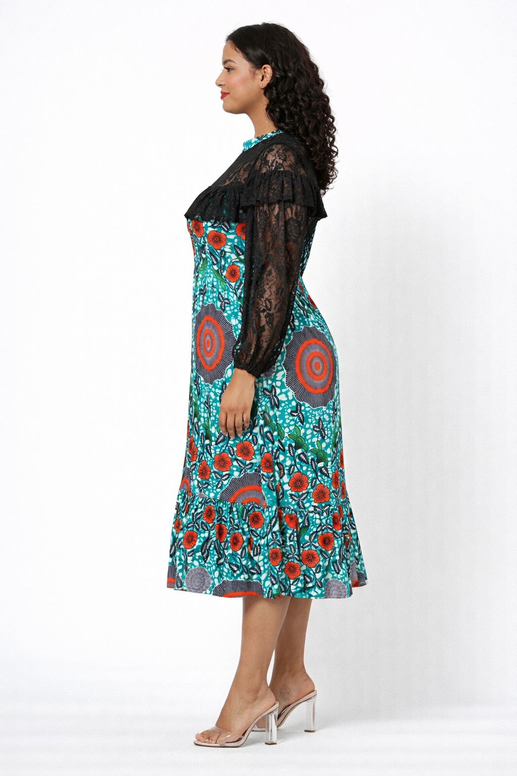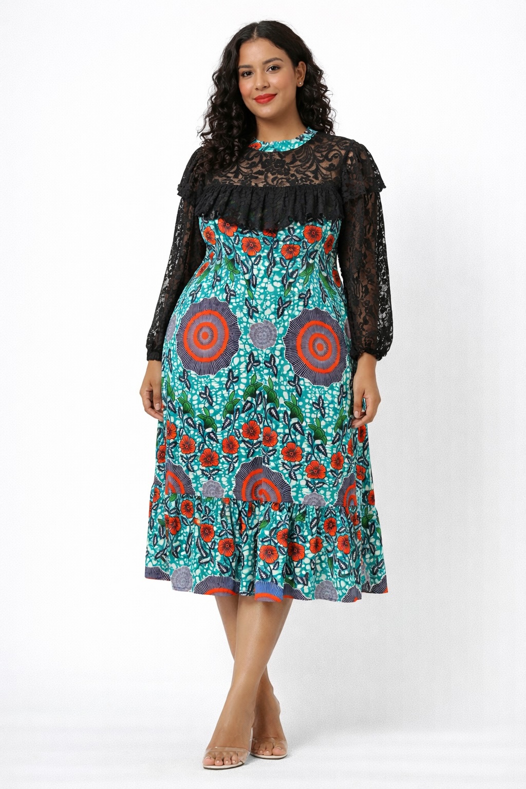 The standout feature is the vibrant African-inspired floral print in teal, orange, grey, and green tones, arranged in bold circular and botanical motifs for striking visual impact. A delicate black lace overlay across the bodice and sleeves adds depth, texture, and a touch of romantic elegance to the overall design.