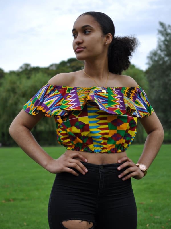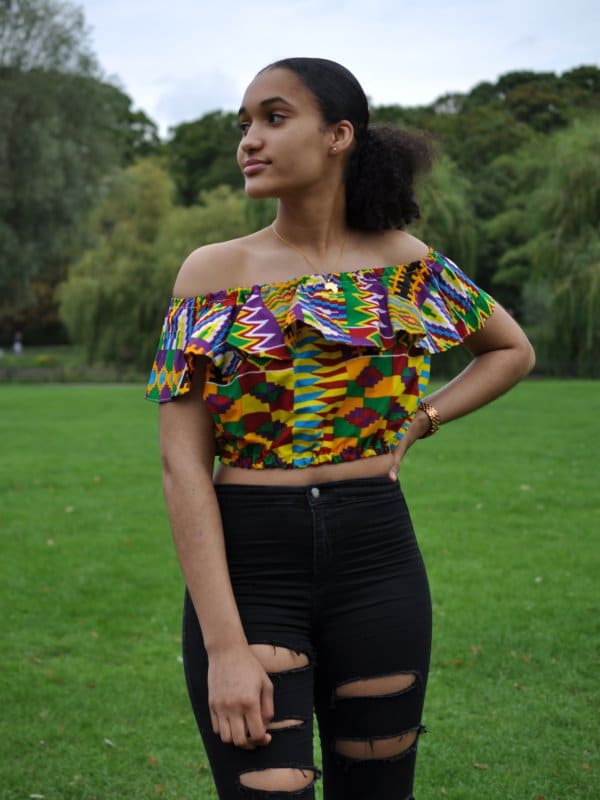 Looking for a crop top? Here you will find our lovely off shoulder frill crop top in African print. With a sexy off shoulder design, this top will take you from the beach to a party in style. Perfect to match with a skirt, shorts or some jeans in summer. Pair with our pretty waistbeads and a necklace to accentuate the bright colours. Made from lightweight cotton-feel fabric, this colourful top will make your outfit stand out. Perfect for a holiday, beach, travel or everyday wear.