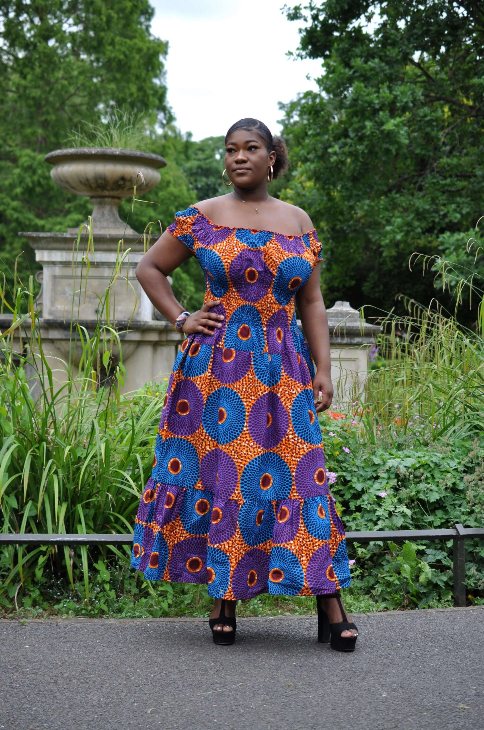 This African Print Ruffle Hem Maxi Dress is perfect for summer! The neckline can convert this blue cap sleeve maxi from a square neck to an off shoulder dress for a flattering look. Pair with a lovely necklace and heels or elegant flats to fit the occasion. This off shoulder summer maxi dress is also available in green. Purchase this custom made blue maxi dress as displayed or customise it with your own design! Change the length, maybe pick a different neckline or choose a different fabric!