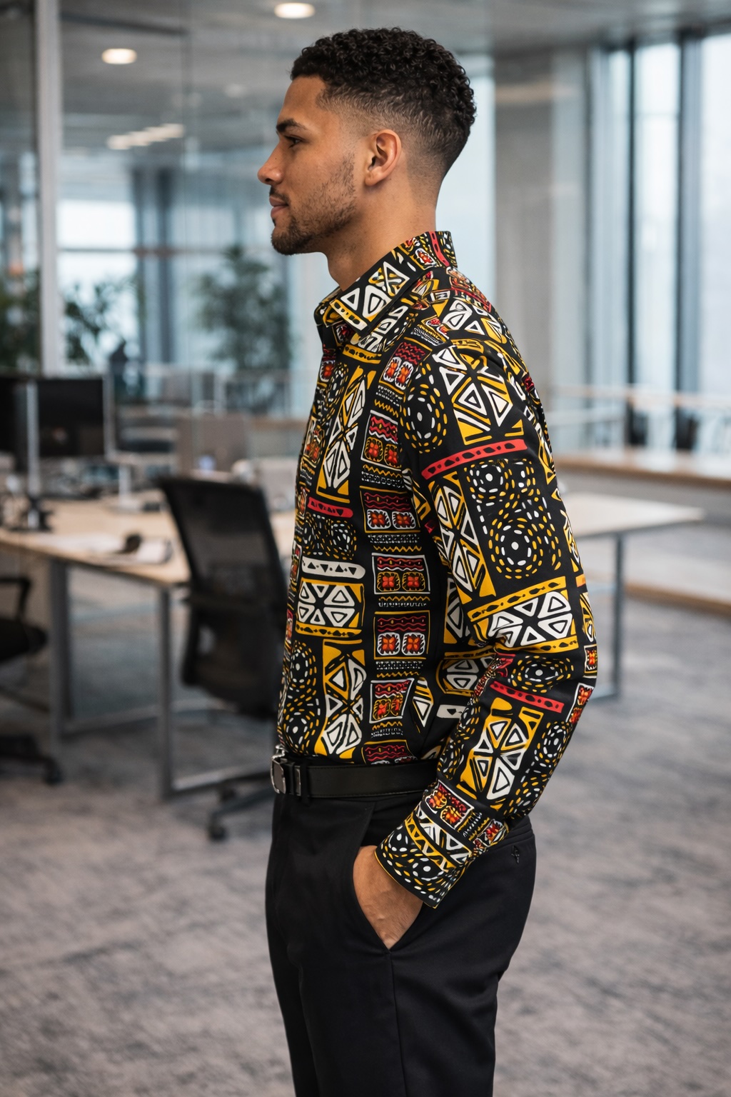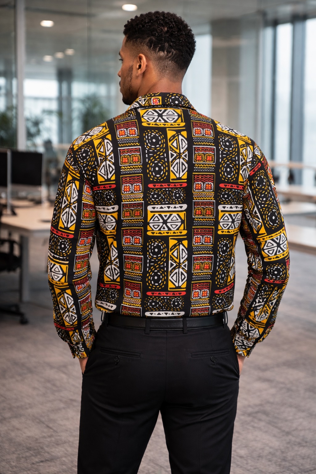 Men’s African Print Button-Up Shirt – Black, Mustard & Red