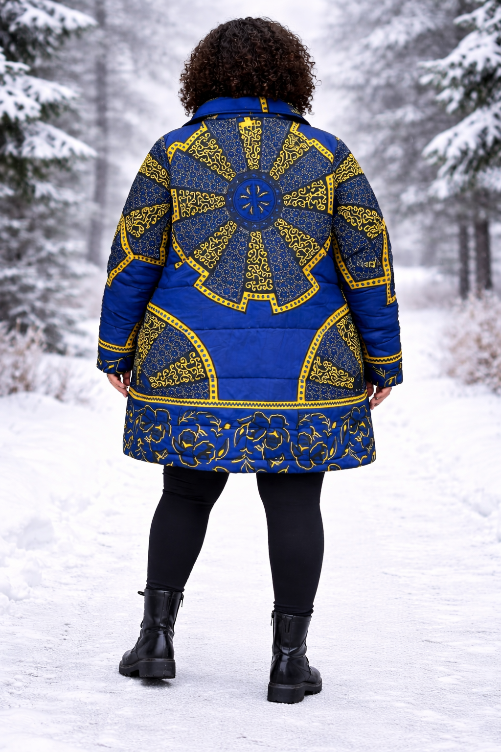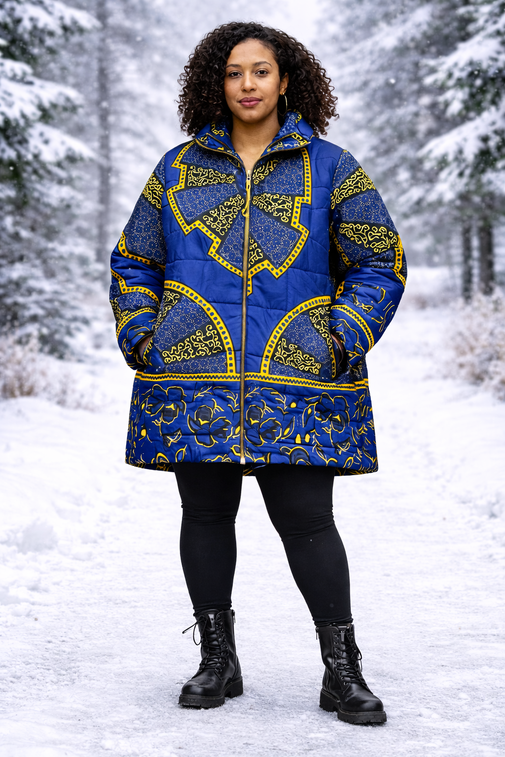 This gorgeous ladies blue and gold Akufo African print (Ankara) puffer coat is great for winter! A perfect blend of style and comfort, this ladies coat has plenty of warmth.