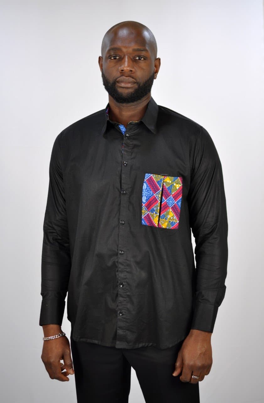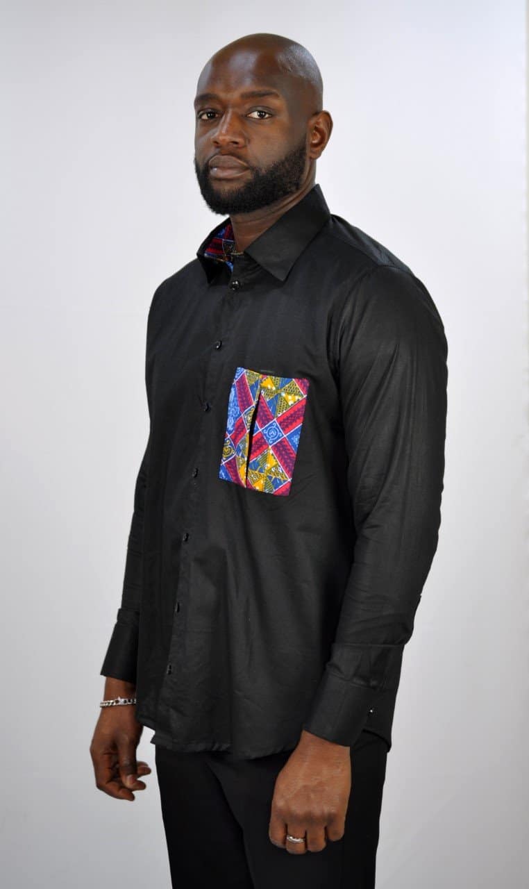 From our range of smart casual/business wear is this versatile black shirt made from polished cotton. This unique shirt is embellished, with a mixed print design made from Ankara cloth, on the pocket and inside the collar to add a touch of Kente. Perfect for when you need something appropriate for work that has a touch of African print!They are perfect for any smart casual event such as work or a relaxed top. Makes the perfect first piece of african clothing for the wardrobe!