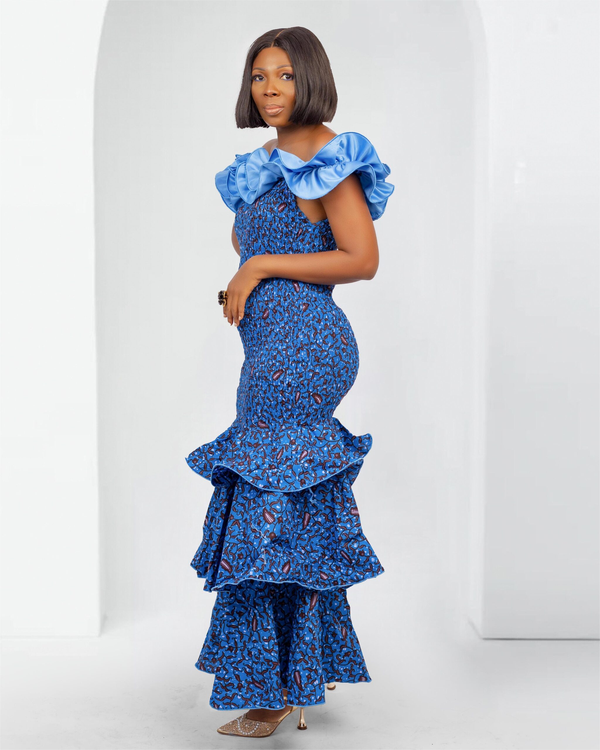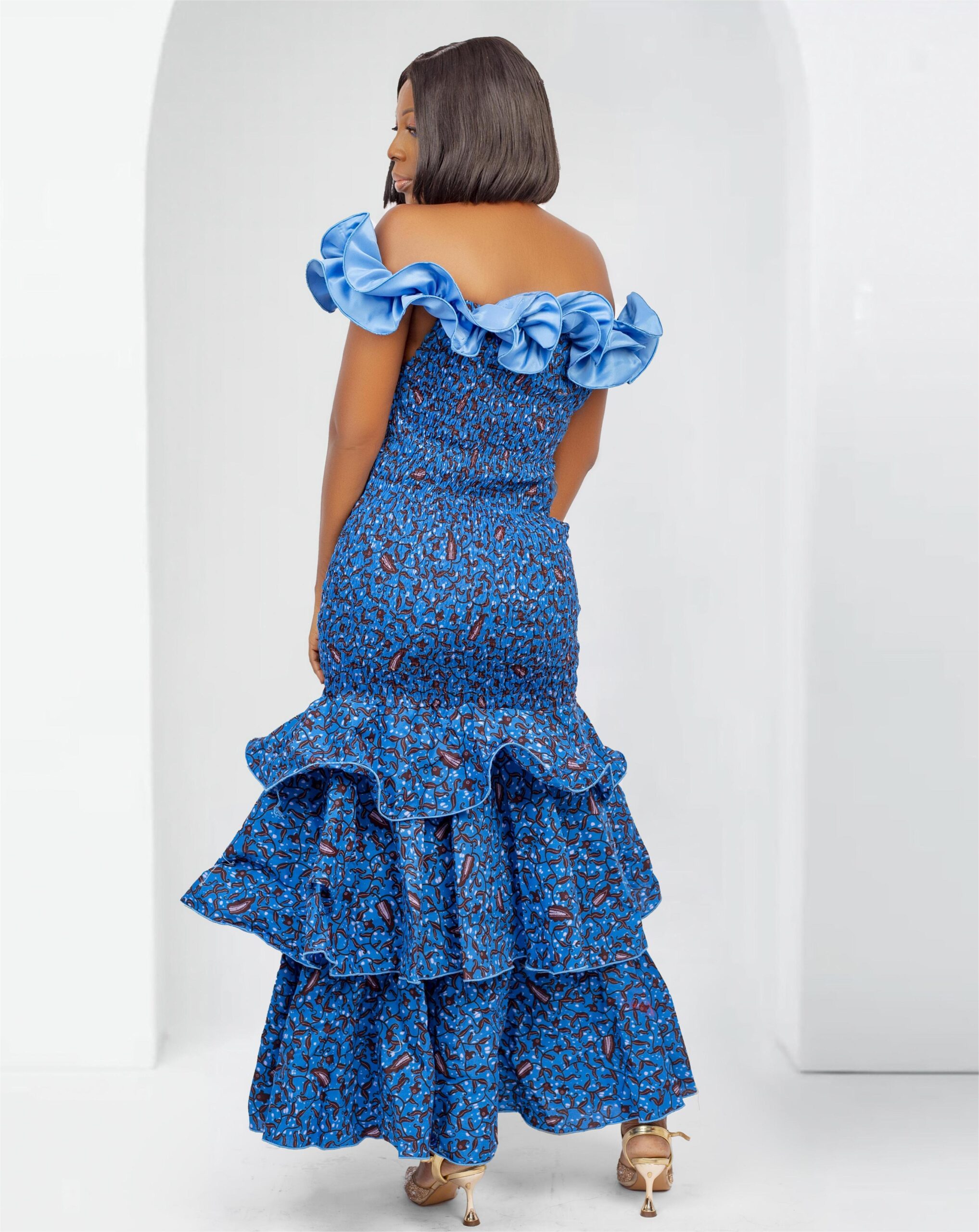 Introducing the Malia Ankara Maxi Ruffle Shoulder Dress, a captivating fusion of elegance and cultural vibrancy. This exquisite gown is a testament to sophistication, blending a classic mermaid silhouette with the rich and vibrant Ankara material and gorgeous ruffles.