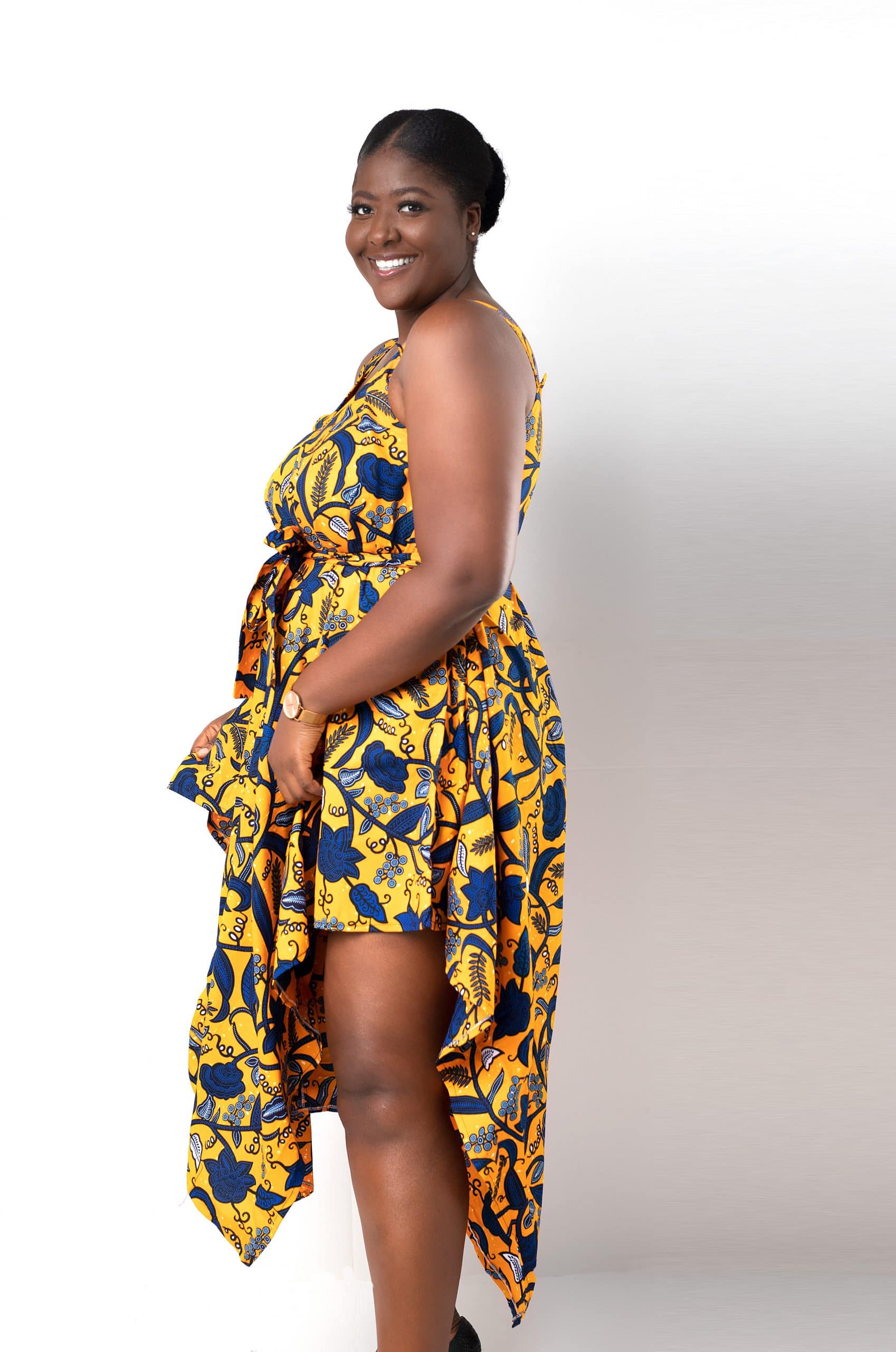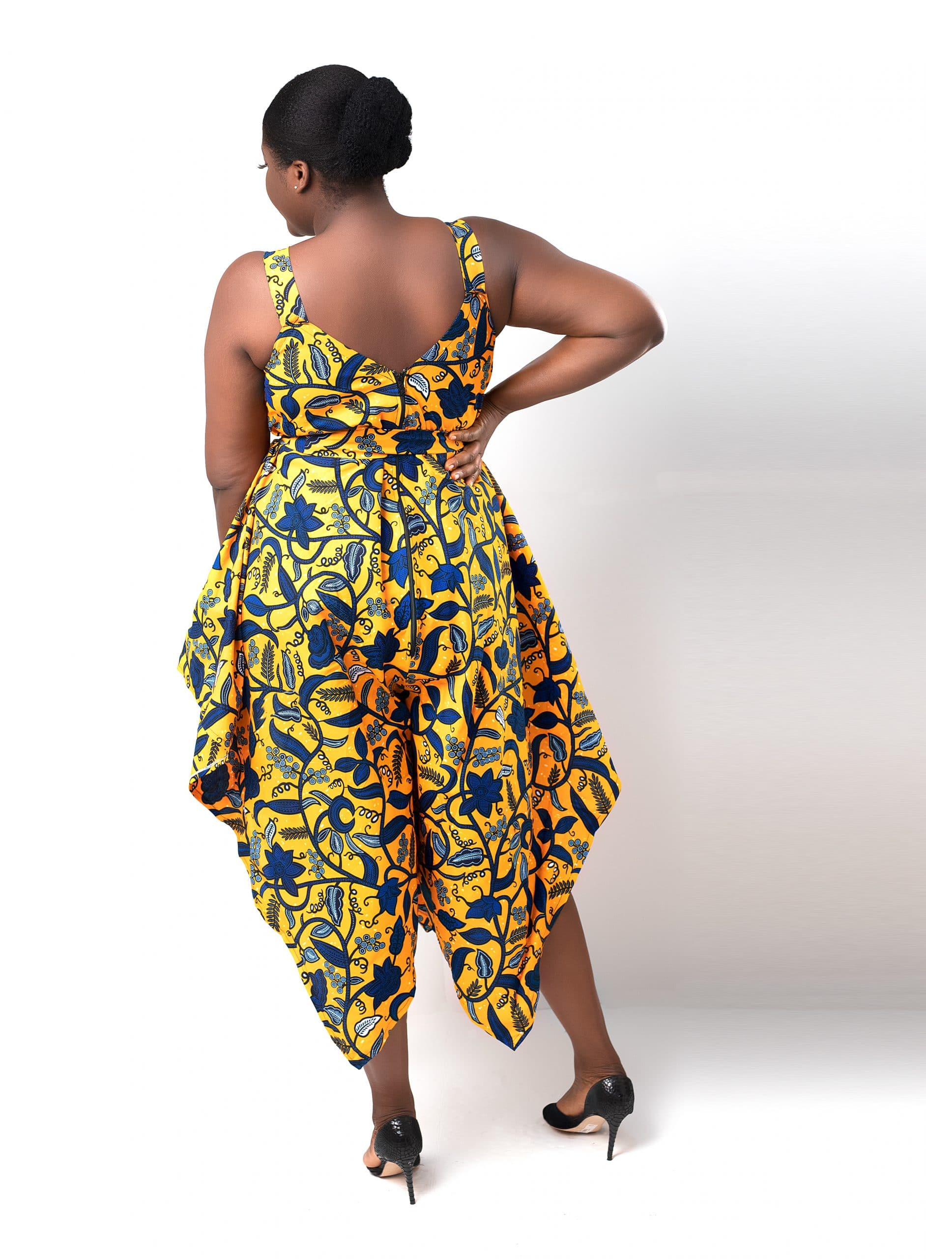 This Asha Yellow & Blue V-neck Ankara Jumpsuit is ideal for that special occasion or event. It has thick, comfortable straps and a midi low v-neck style that is very flattering and leaves room for jewellery. It also has a distinct design with high sides on the legs, which contributes to its elegant appearance. In this jumpsuit, you’ll be the best dressed at any occasion!