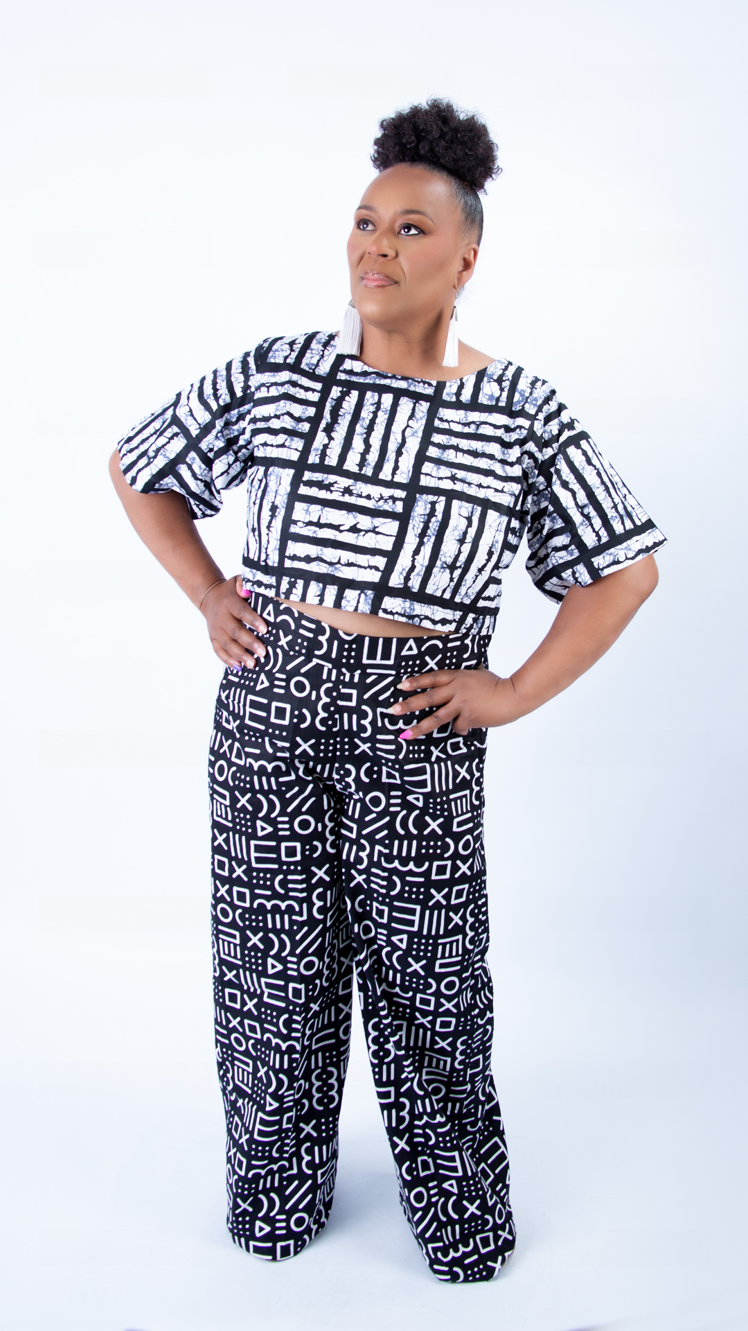 Elevate your style with this stunning black and white Ankara co-ord set, a perfect fusion of bold patterns and classic silhouettes. This two-piece ensemble consists of high-waisted, wide-leg trousers paired with a chic cropped round-neck, short-sleeve top, creating a look that is both timeless and contemporary.