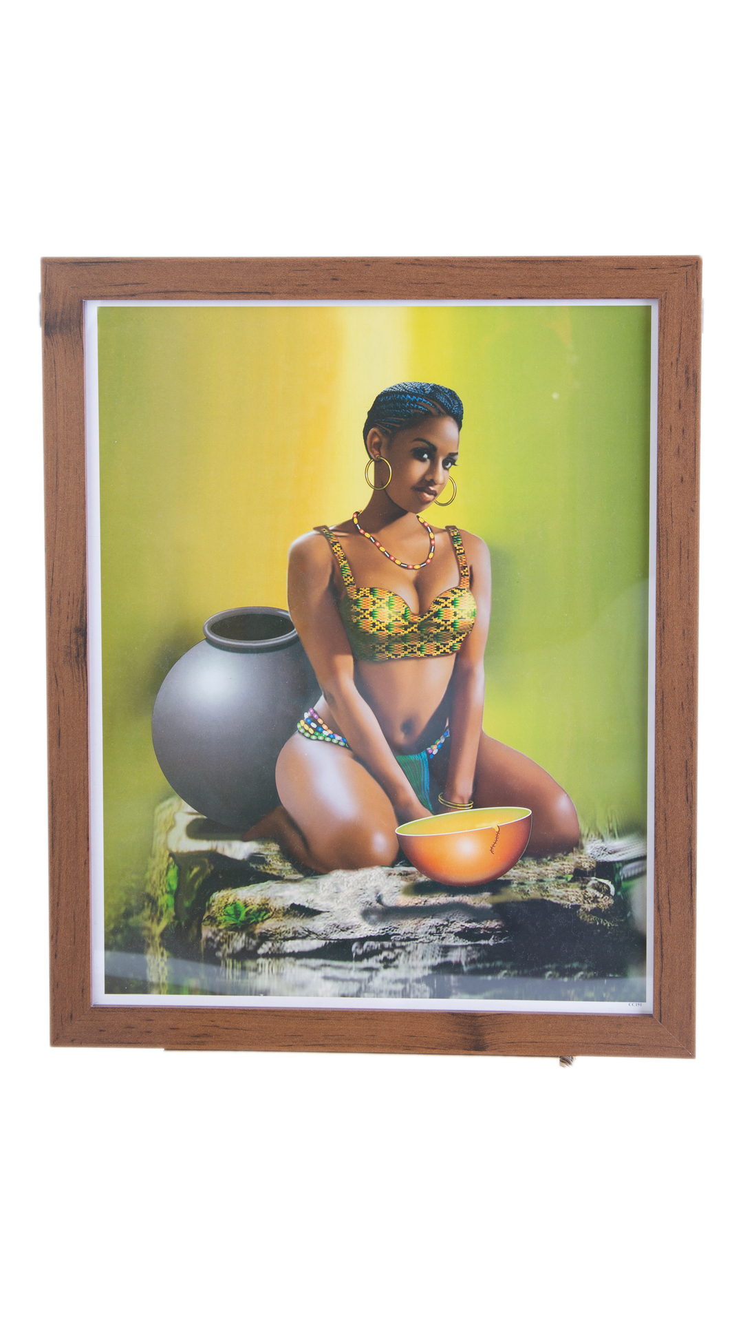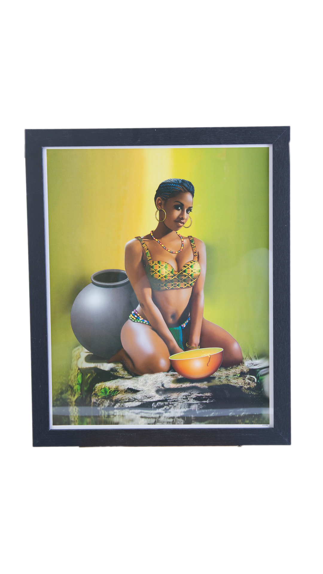 This stunning portrait features a beautiful Black woman kneeling gracefully on rocks, surrounded by traditional pots. The imagery evokes a deep sense of beauty, tranquility, and connection to the earth. Available with a sleek black frame or a warm brown frame, this piece radiates elegance and heritage, making it a standout addition to any decor.