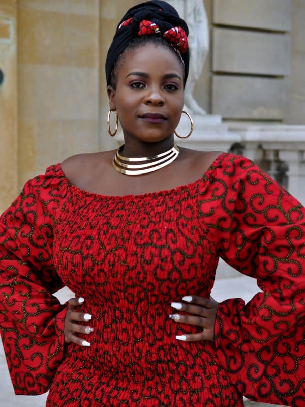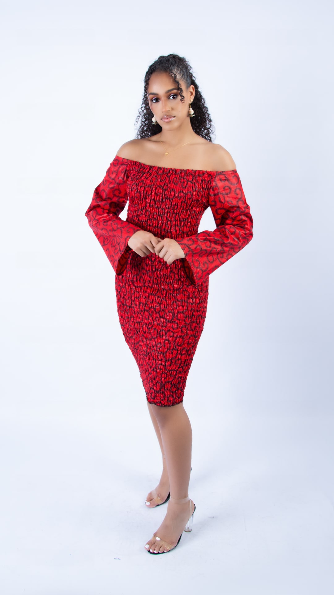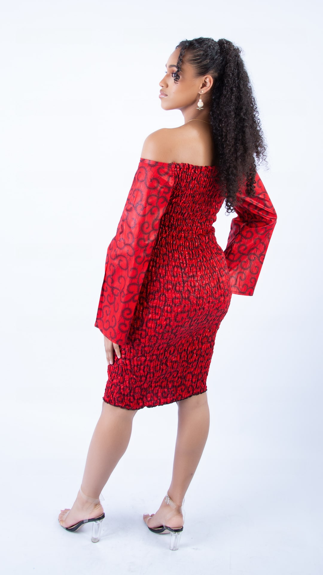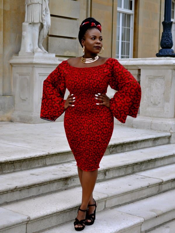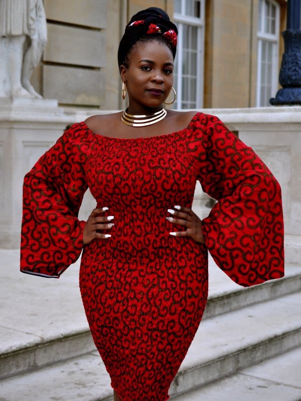 Crafted from 100% African wax cotton. Moreover, the fabric features a striking all-over Ankara pattern in a rich red and black colour palette, inspired by traditional Kente and geometric prints. Also, the knee-length body-con silhouette flatters the figure with a natural waistline and a pencil-shaped hem, creating a sleek and sophisticated look. For added versatility, the length can be customised to suit your personal preference.
