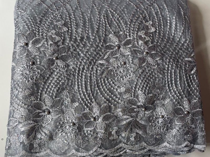 This beautiful Silver French Lace Fabric features embellished stones in the lace. Perfect for making dresses, tops, skirts, blouses or trousers, or any outfits and is very high quality. Featuring beautiful patterns and embellishments, this Silver French Lace Fabric can be lined with any fabric of your choice. It comes in 5 yards. This lace can also be shipped worldwide!